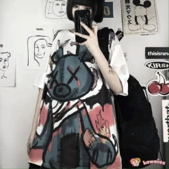 This short-sleeved t-shirt is essential for anyone who loves emo-themed tops or e-girl fashion. Pair it effortlessly with a skirt, thigh-high socks, and stylish sneakers for a kawaii look! Featuring a sad teddy bear printed on the front with wings. It’s just the thing to add a bit of fun to your weekend outfits, you know?