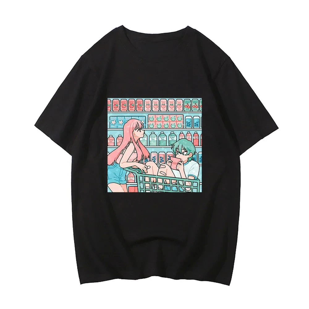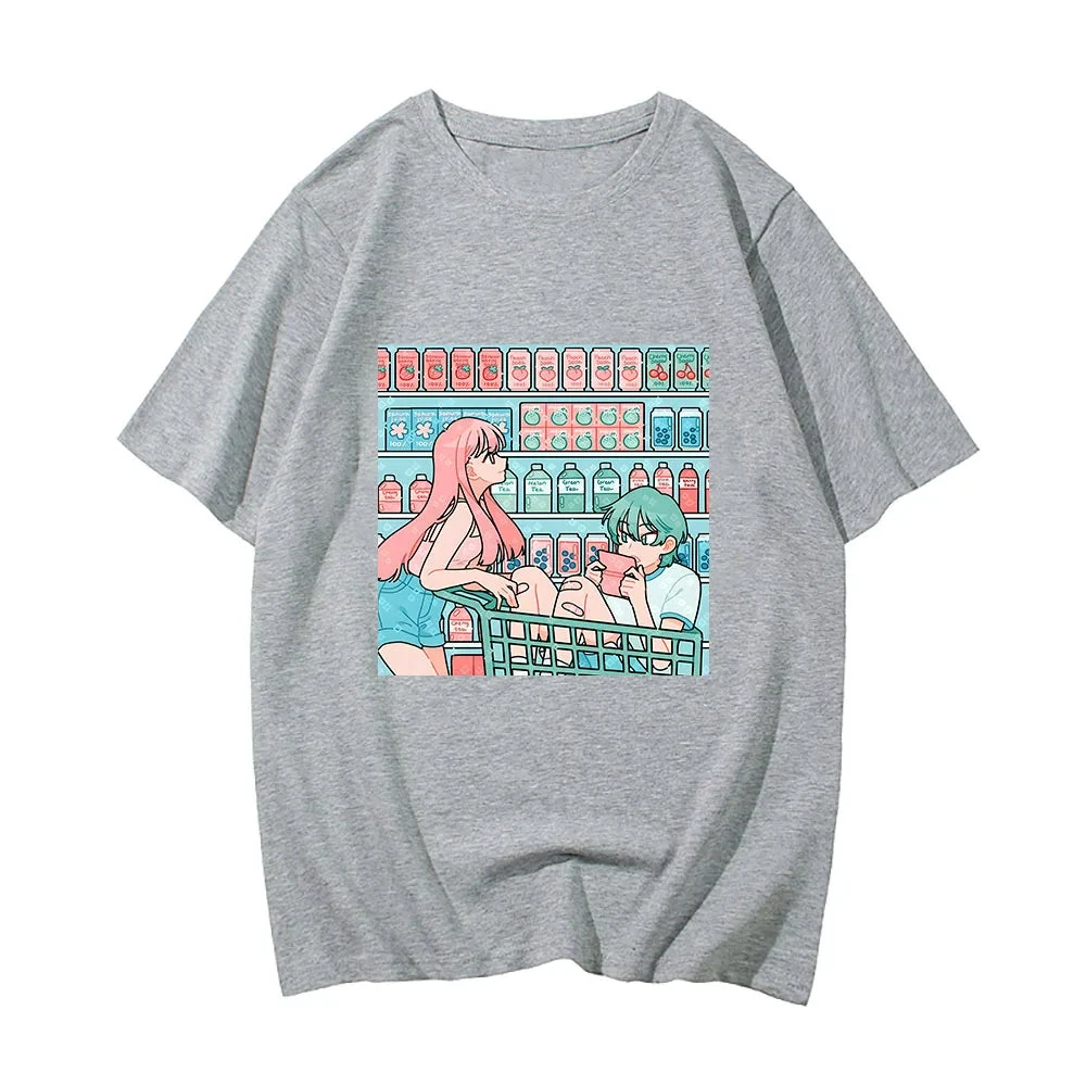 Look no further! This is the perfect top for anime lovers showcasing a pastel illustration of a coupe shopping in the drinks aisle. A lightweight classic tee that effortlessly adds a kawaii flair to your daily routine.