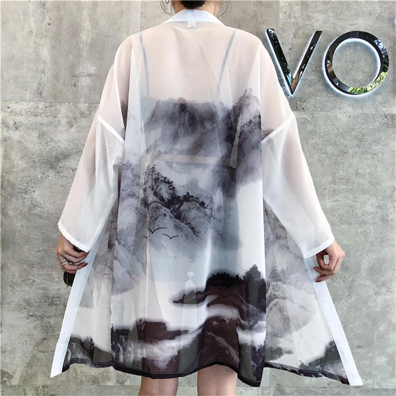 This kimono is the perfect addition to your chic but relaxed wardrobe. Featuring an open neckline, gathered back detail, and a longline cut, it is a flattering choice. Made from soft-touch fabric with a misty mountain pattern on a white background, it looks great worn over jeans or as an oversize cover-up.