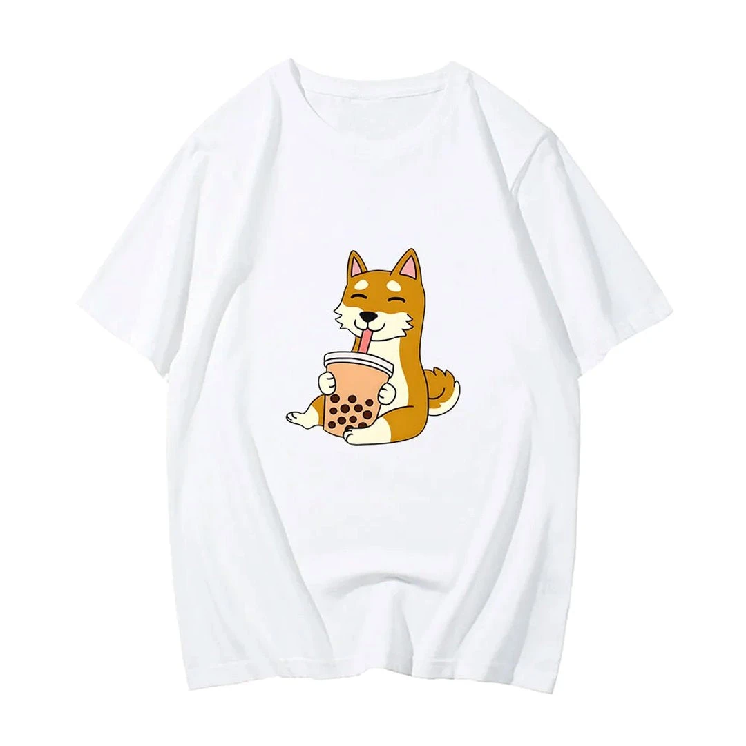 We have, and this is how it’ll look. This women’s tee features an adorable Shiba cheerfully drinking bubble tea and minding his own business printed on the front. With a classic oversized look, this high-quality cotton tee is great to add some fun to your wardrobe.