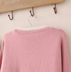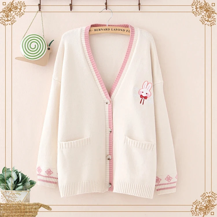 Be cozy and chic all season long in this kawaii knitted cardigan! Featuring an embroidered white bunny with patterned sleeves, a V neckline, a four-summary placket, and long sleeves, this comfy cardi is sure to be your go-to for all your weekend adventures.