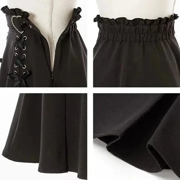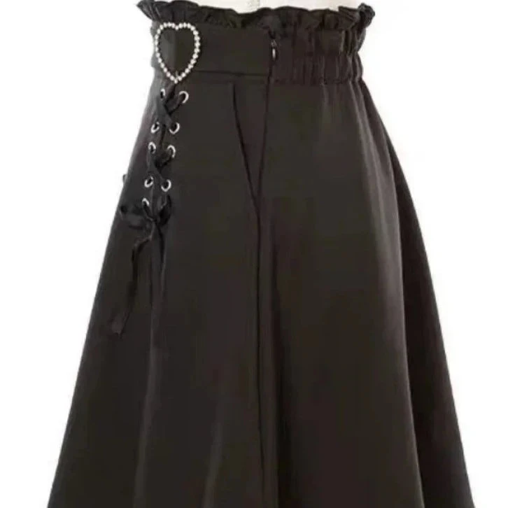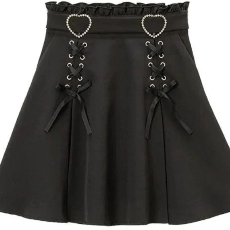 Crafted from high-quality polyester, this skirt is soft, lightweight, and includes small pockets for your essentials. It features a stretchy elastic waistband adorned with two hearts on the front and a black ribbon bow.
