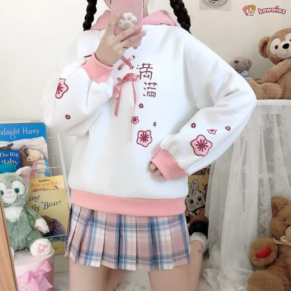 Experience the ultimate coziness with these thick candy floss-themed hoodies, perfect for pairing with a kawaii skirt, leggings, and boots for a Harajuku look. Whether you’re chilling at home or going into the city with your besties, these are the perfect hoodies. Featuring printed sakura petals, kanji text and a criss-cross lace design on the front with a two-tone colourway.
