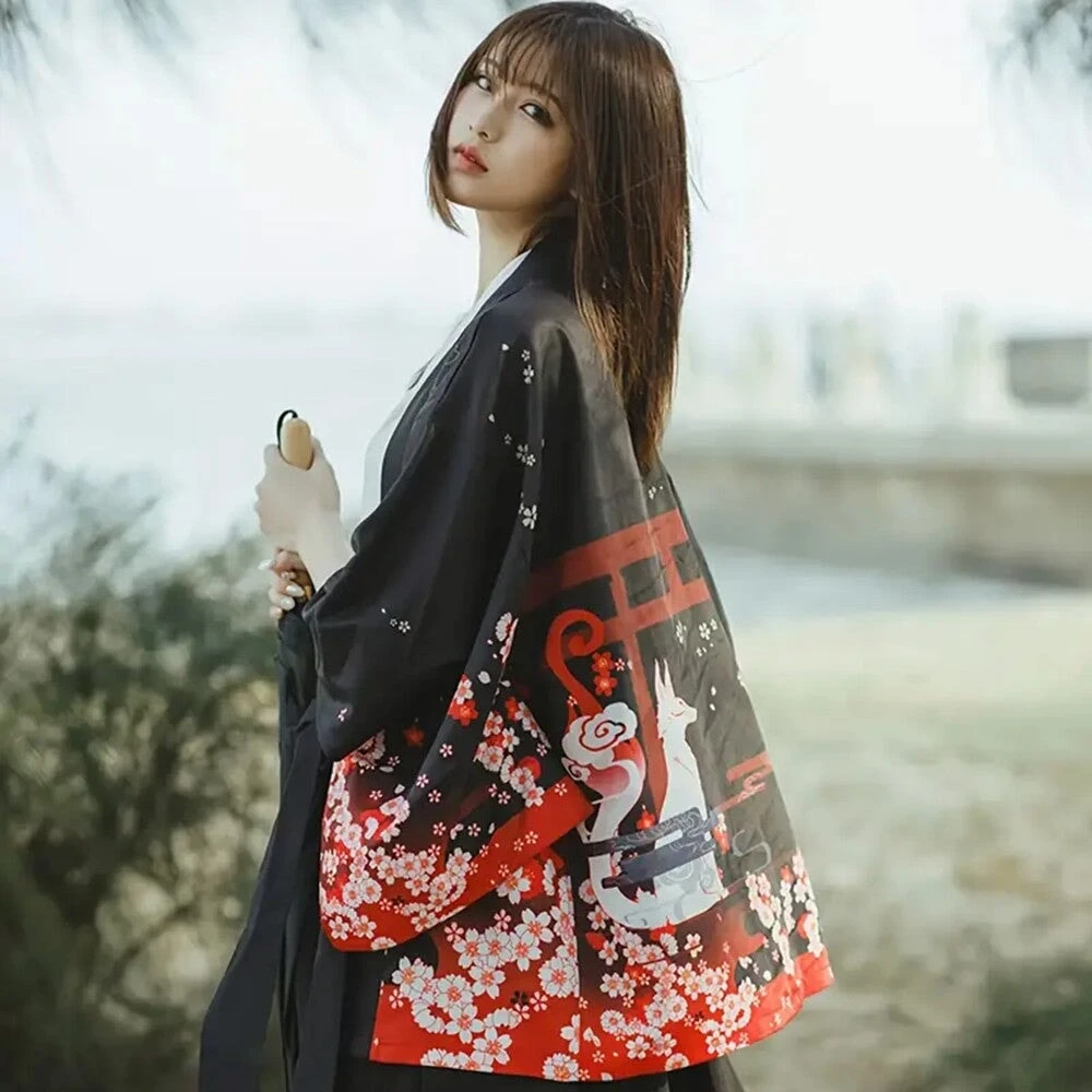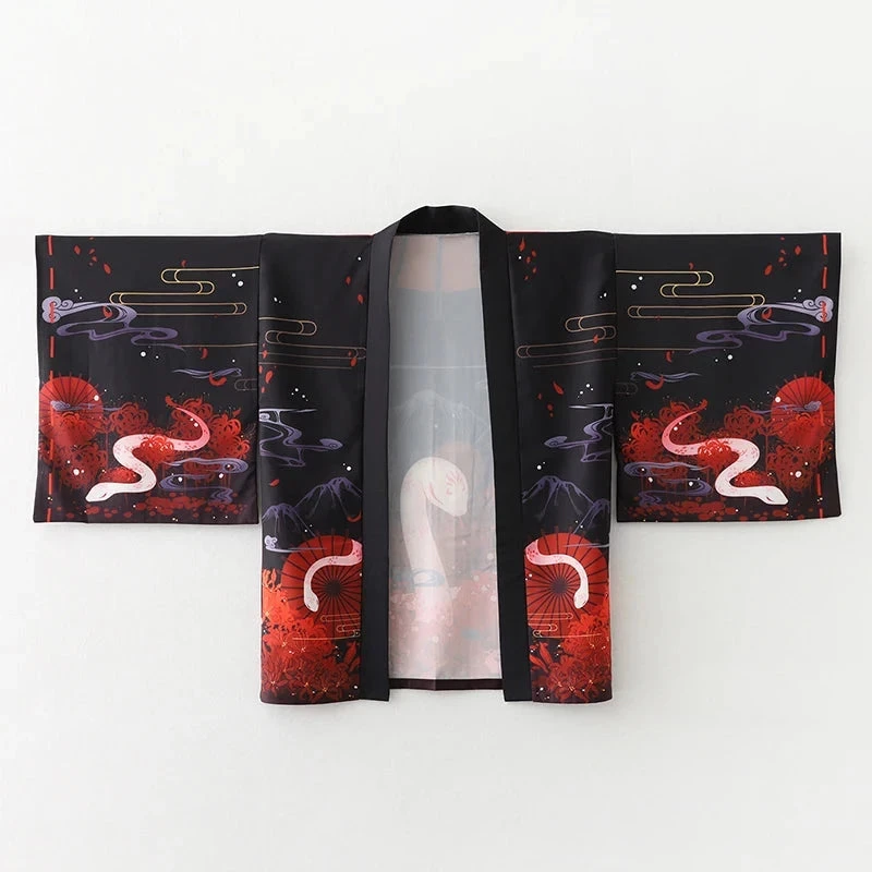 Slip into this affordable kimono, designed to feel soft and comfortable on your skin while adding a hint of Japanese flair to your wardrobe. Featuring two kimonos, each with a black canvas featuring red accents and a highly detailed illustration of shrines, cherry blossoms, smoke, and a white snake or foxes. With its classic loose fit, this kimono feels light and silky all day long.