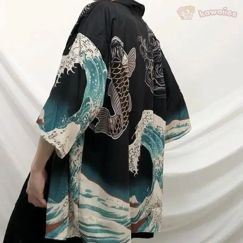 Feel the refreshing summer breeze in this stunning unisex kimono, showcasing the iconic Kanagawa Wave pattern and a koi fish jumping out of the ocean.