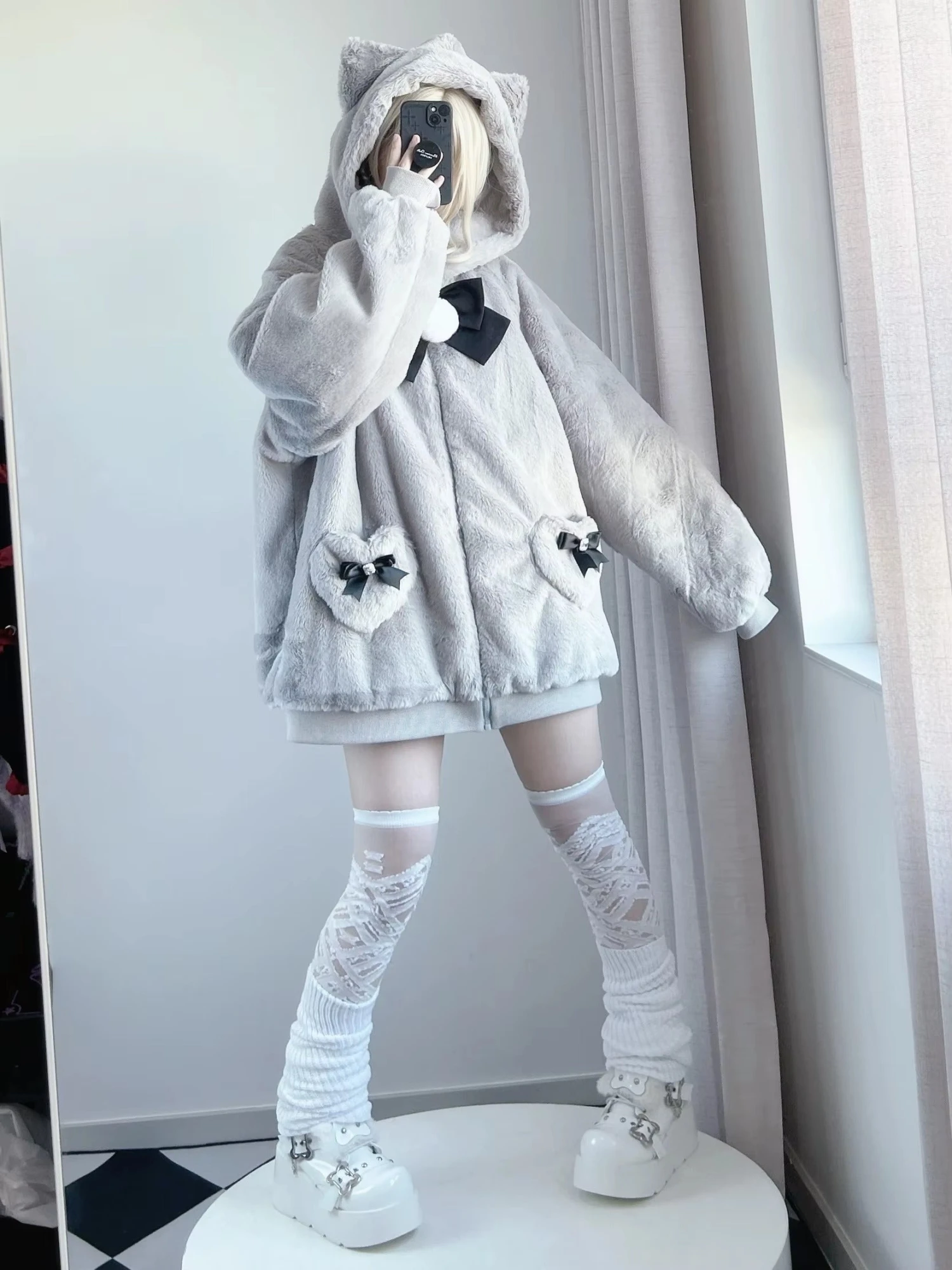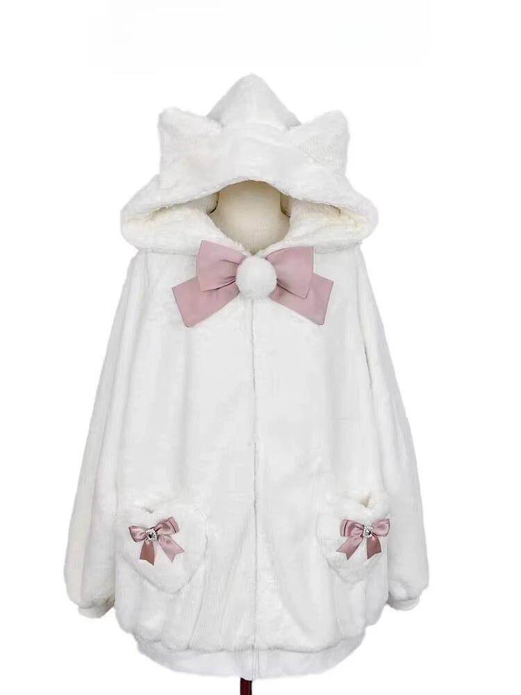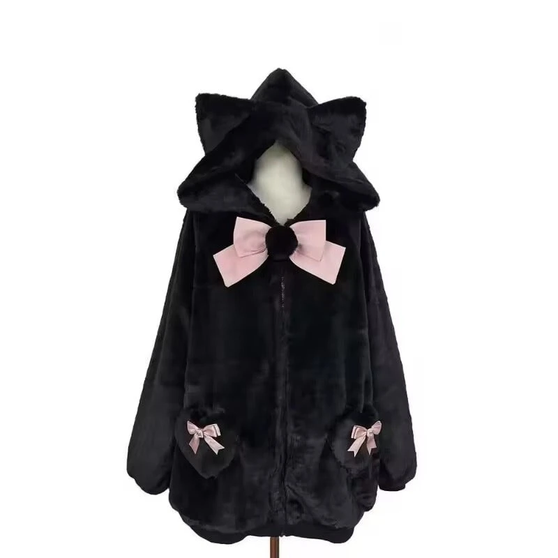 With ultra-soft faux fur, a cuddly oversized fit, and adorable details like 3D cat ears, a big pom-pom bow, and heart-shaped ribbon pockets, this jacket isn’t just warm — it’s irresistible.