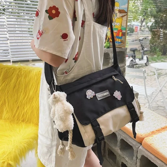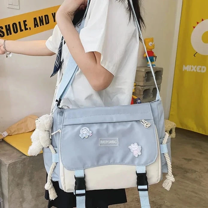 This kawaii and functional side bagfeatures several different large compartments, many pockets inside, and a couple of exterior pockets. Wear this bag on your side with adjustable straps. Buckle up to keep your main compartment safe from pick pocketers. Made from high-quality waterproof materials with enough space to fit all of your essentials. Free bear pendant included.Â