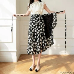 This flowing midi wrap skirt features a delicate floral print creating timeless charm, perfect for both casual outings and special occasions. The wrap design flatters every silhouette, cinching at the waist with a graceful tie that allows for a customizable fit. Crafted from lightweight, breathable fabric, it ensures comfort and ease of movement throughout the day.