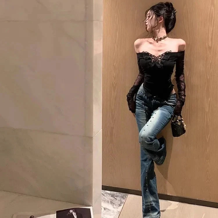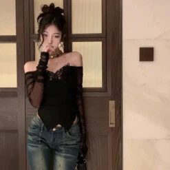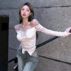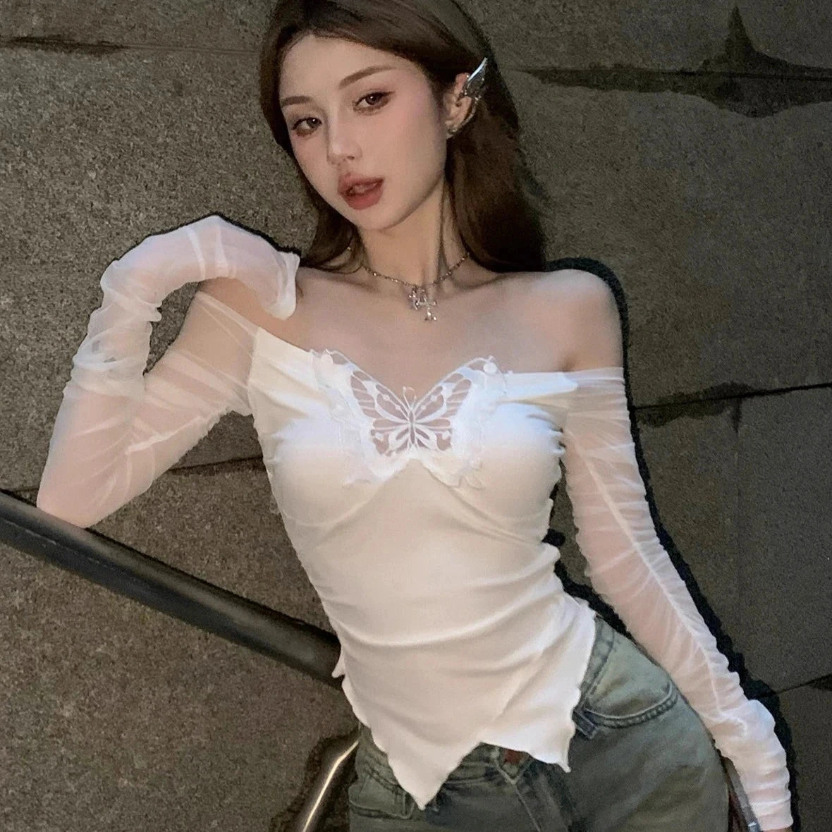 Add this to your weekend fit featuring mesh like sleeves, a lace butterfly on the front and an off-shoulder long-sleeve design. Enjoy wearing this top when you’re out with friends! Pair it effortlessly with jeans and fresh kicks.
