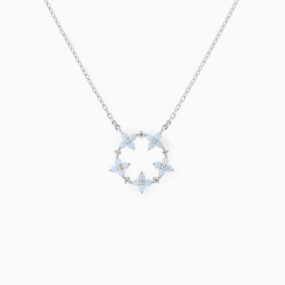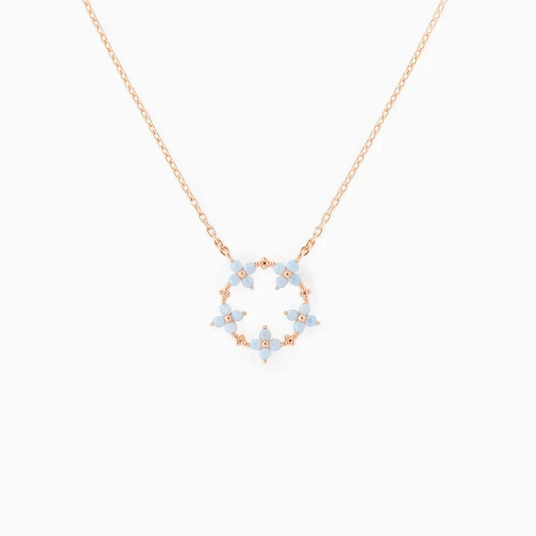 Whether you choose the station necklace, featuring a gentle trail of petite blossoms, or the pendant version with a radiant blue flower halo, this piece captures the essence of springtime serenity all year long.