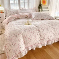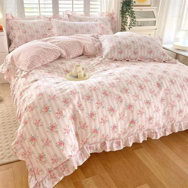 Made from 100% premium cotton (200gsm), this bedding set feels incredibly soft, breathable, and durable. Designed with delicate ruffles and a charming floral pink aesthetic, it adds a natural touch to your sleeping sanctuary. Plus, with its reversible print, you can switch up your style anytime!
