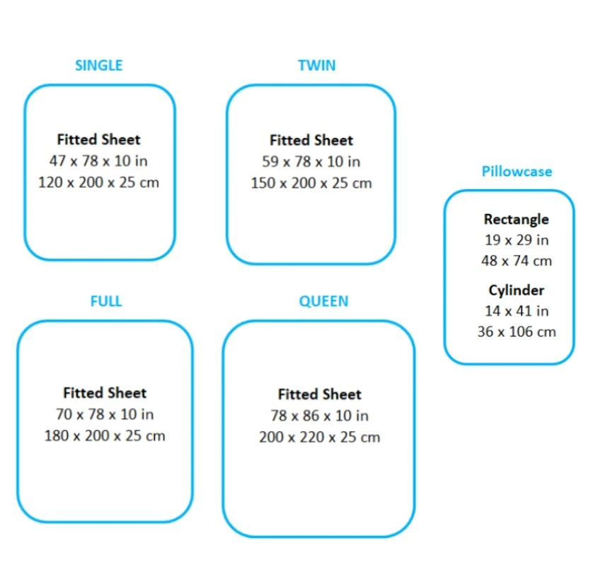 The bedding sheet comes in four different sizes, measurements shown below.Â