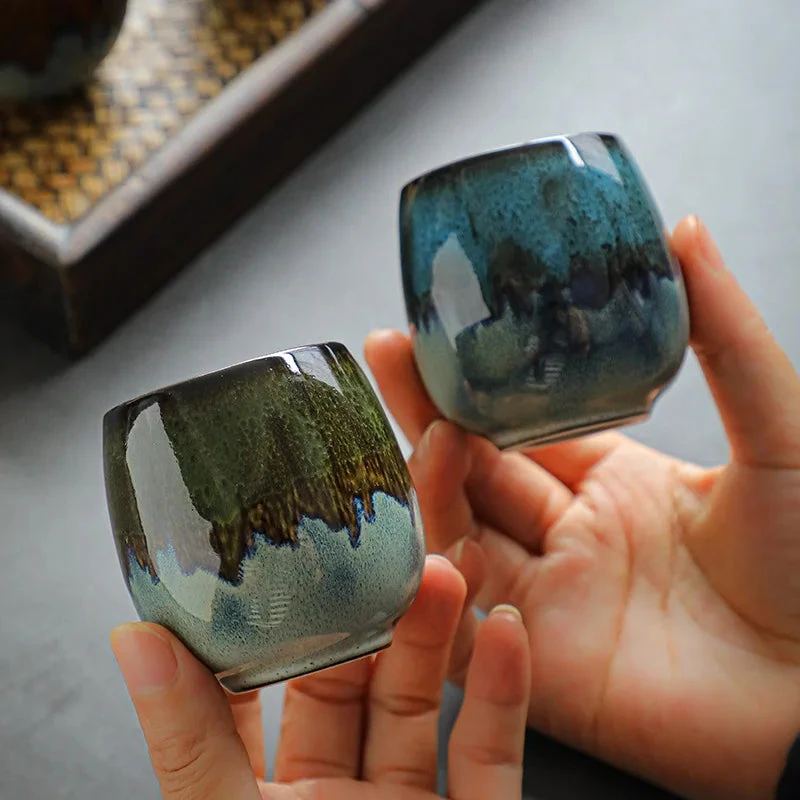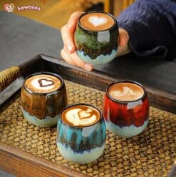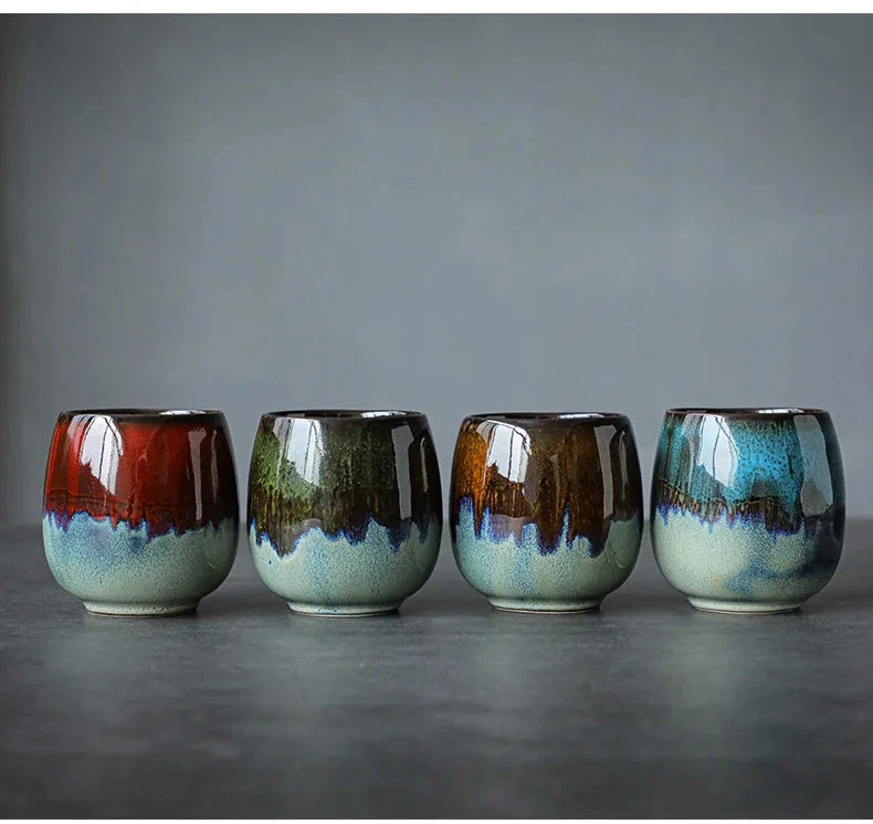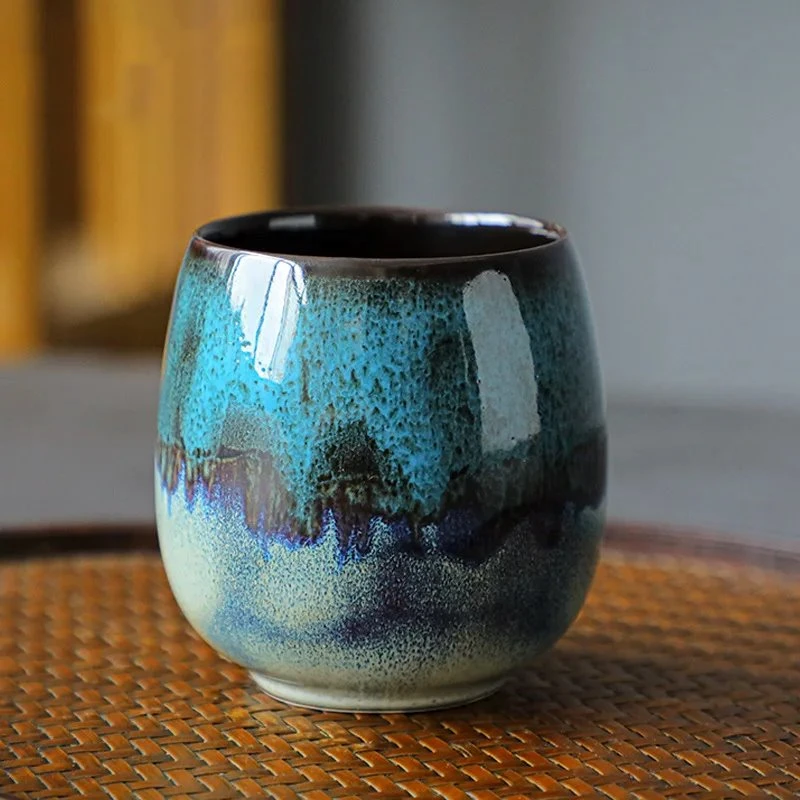 The craftsmanship of these ceramic cups adds an element of surprise, with each cup exhibiting a unique outcome after the kiln process – often described as “one color in the kiln, several colors out of the kiln.” The natural formation of colors during high-temperature firing makes each cup distinctive.