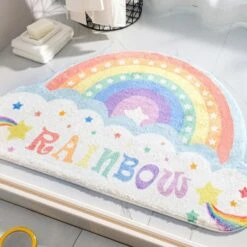 Change your bathroom or room with just one touch! Start with these fun and decorative bath mats featuring a vibrant rainbow mat with stars, clouds and a rainbow. This mat has a soft and squishy texture with its soft plush surface. It has a non-slip backing that is durable and long-lasting. Ideal accent for any bathroom, washstand, master bathroom, children’s bathroom, guest suite, kitchen, laundry room, spa, holiday home, or hotel bathroom.
