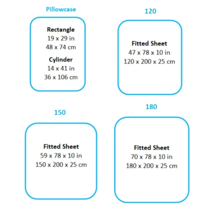 The bedding sheet comes in four different sizes, measurements shown below.Â