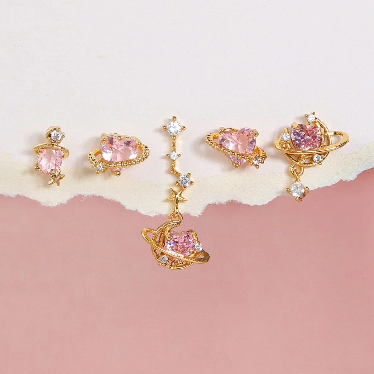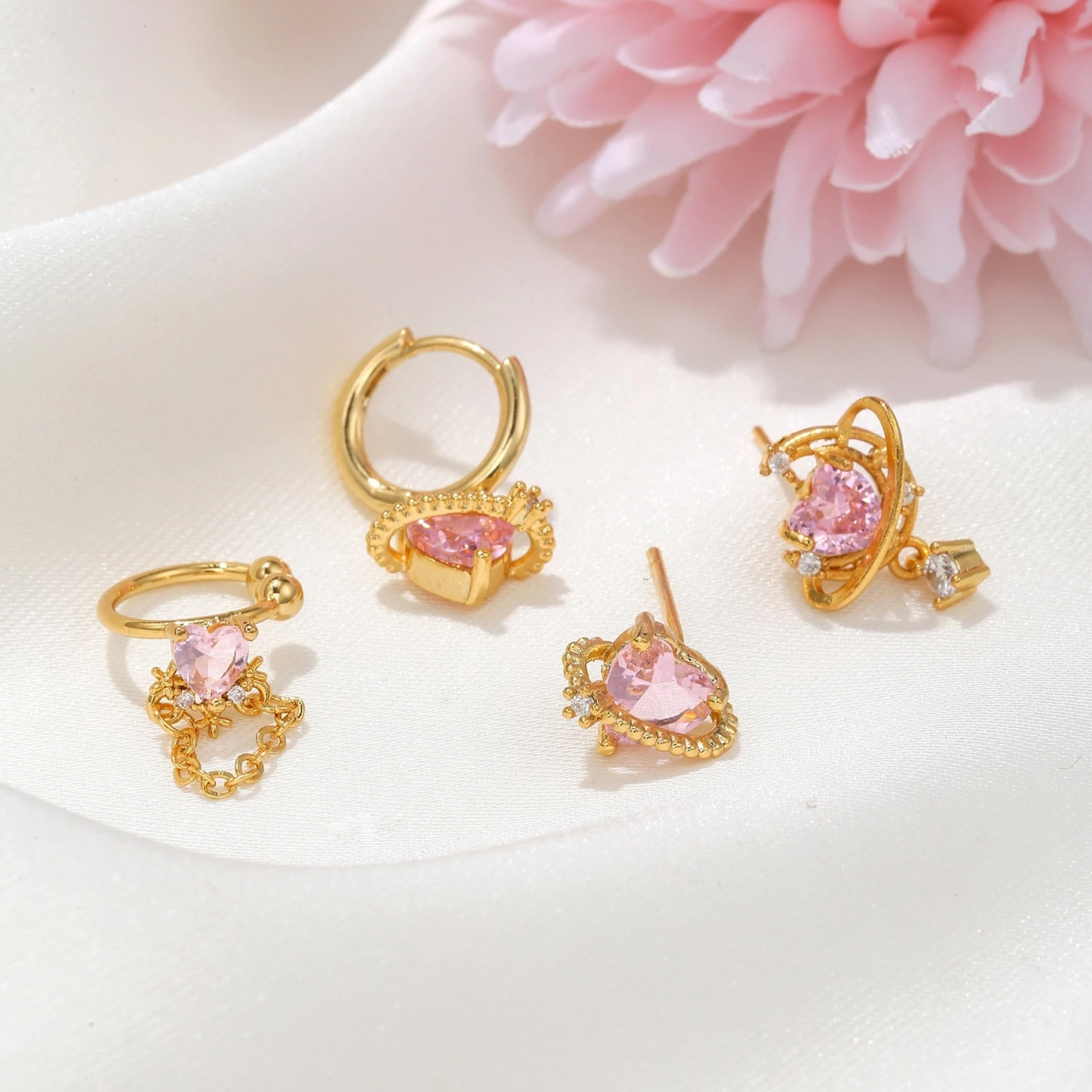 A symbol of love and beauty to add a glimmer to your outfit. These heart-themed earring sets are made from copper and 18K real gold plating. With a light pink/purple stone at the center and small details, this is a set to add to your earring collection.